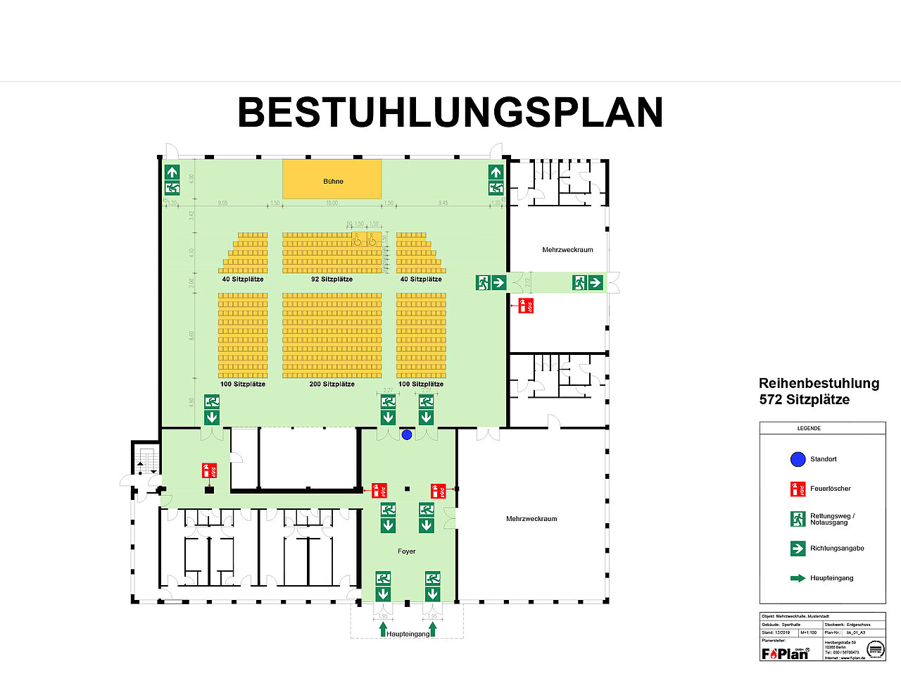 Der Bestuhlungsplan zeigt die Bestuhlungsart (z.B. Theaterbestuhlung, Bankettbestuhlung, Blocktafel) inklusive der Plätze für Rollstuhlbenutzer, die Bühne oder Szenenfläche, die Anzahl und Breite der Notausgänge sowie den Verlauf der Rettungswege.